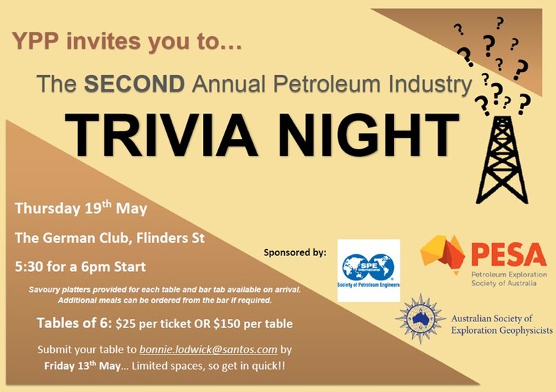 YPP are hosting The Second Annual Petroleum Industry Trivia Night on Thursday 19th May at the German Club, on Flinders St